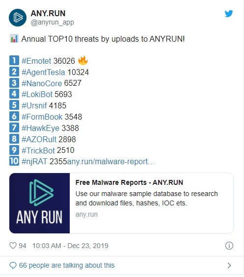 Analiz amacıyla bir sanal alanda çalışan kötü amaçlı yazılımlarla etkileşime izin veren bir kamu hizmeti olan Any.Run, platforma yüklenen en yaygın 10 tehdit içeren bir liste derledi. Listenin başında Emotet var.