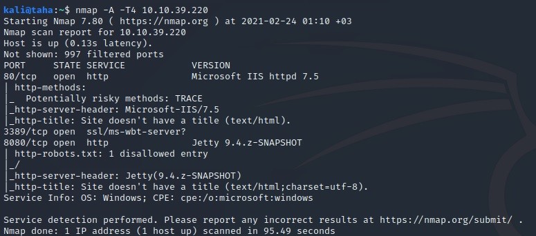 nmap -A -T4 10.10.39.220 ile nmap taraması yapıldığında 80, 3389, 8080 portu açık olduğu görülüyor.