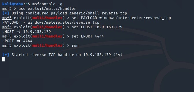 İlerleyen aşamada meterpreter bağlantısı kurulacağı için msfconsole komutuyla metasploit başlatılır ve gerekli konfigürasyon ayarları yapılır.