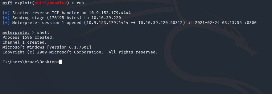 Payload çalıştırıldıktan sonra metasploit’de sırasıyla run ve shell komutlarıyla meterpreter bağlantısı sağlanır.