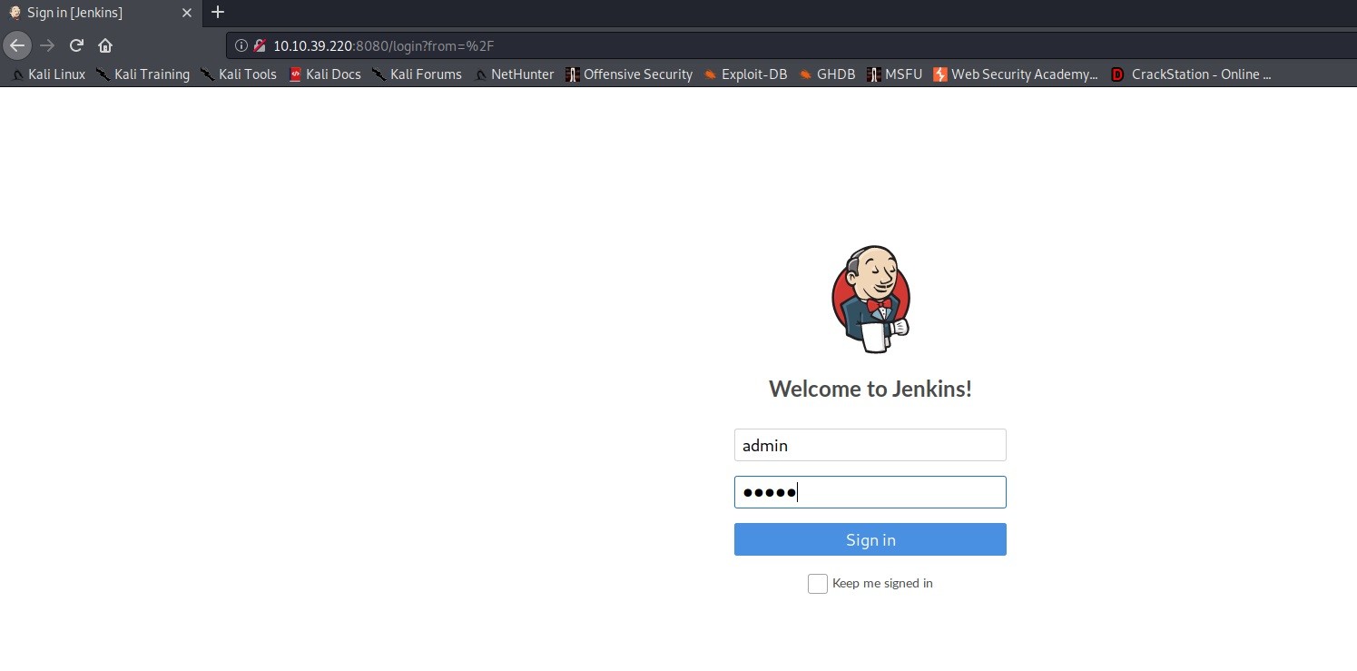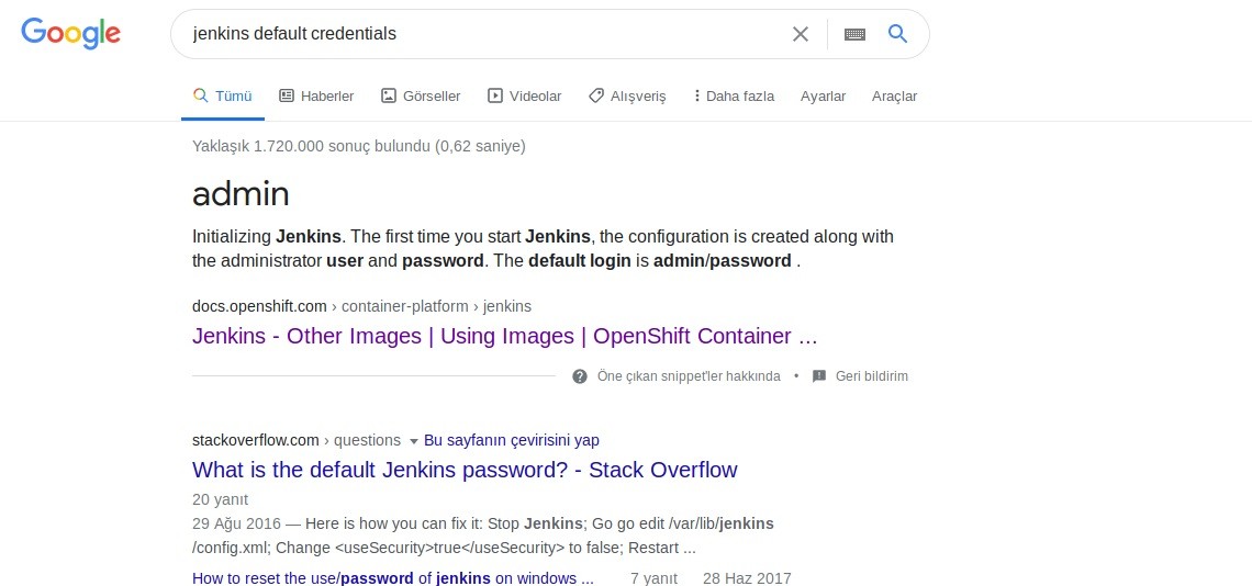 Varsayılan kullanıcı adı ve parola girildiğinde giriş yapılabiliyor. Eğer giriş yapılmasaydı brute force saldırısı denenebilirdi. Varsayılan kullanıcı adı ve parolanın öğrenilmesi için google’da jenkins default credentials araması yapılabilir ve admin/password olduğu öğreniliyor.
