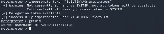 Administrators token’ını taklit etmek için impersonate_token “BUILTIN \ Administrators” komutunu kullanılır.