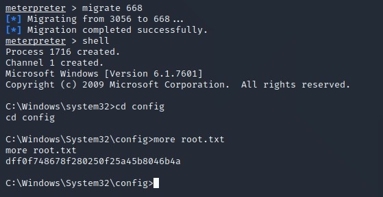 Tekrardan shell olunduktan sonra config dizinine gidilir ve root flag’ına da ulaşılır.