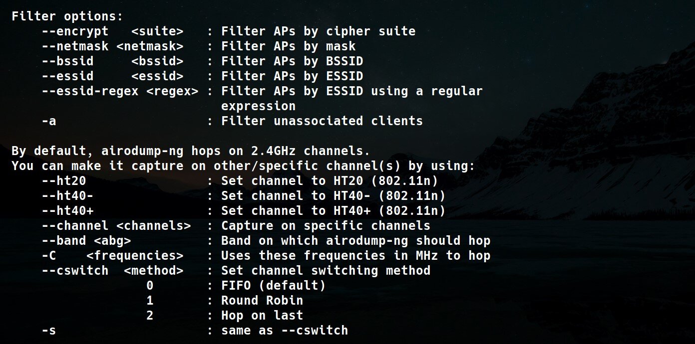 - –band <abg> : Airodump-ng’nin atlaması gereken bant