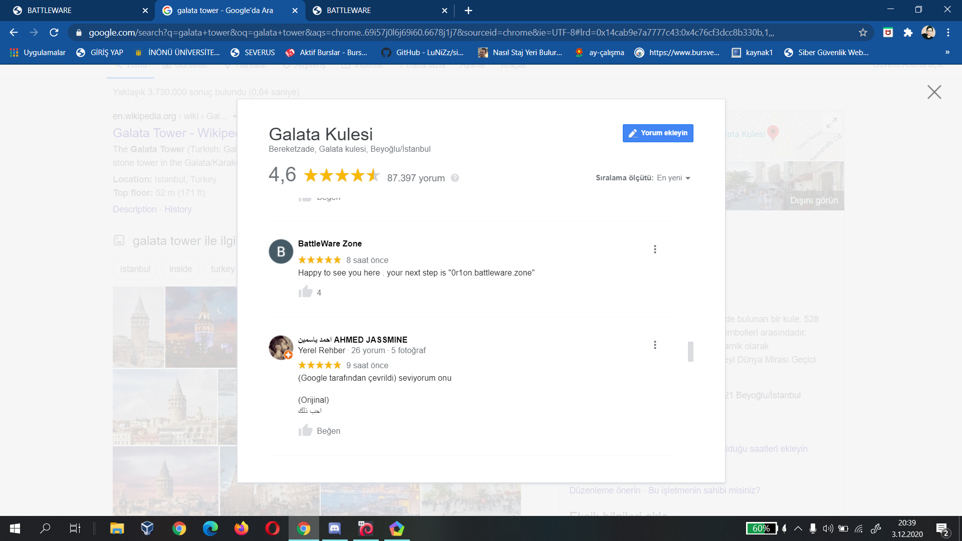 Sorunun içinde “yorumlarda beş yıldız verdim” şeklinde bir ipucu vermiş. Bunun üzerine google ‘a galata tower yazarak yorumlar kısmına gittik.