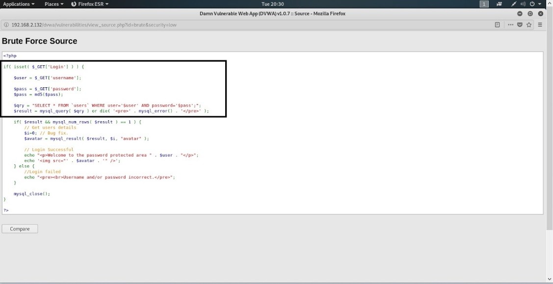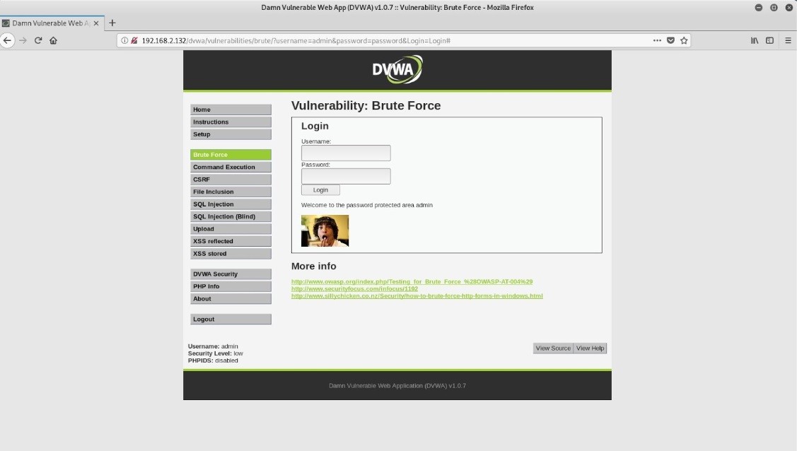 Şimdi saldırımızın nasıl yapıldığına geçelim. Hedef sistem için DVWA’mızı açıyoruz. Giriş panelimizin koduna baktığımızda kullanıcı adı ve şifre girişinin kaç kez yapıldığını kontrol eden bir sistem yok. Bu da brute force açığının ortaya çıkmasını sağlıyor.