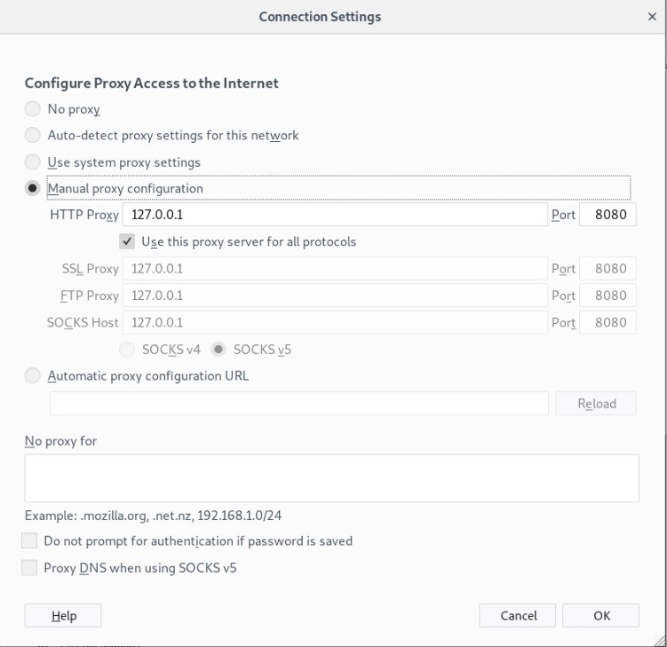 Preferences -> Network Proxy – > Settings’e giriş yaptıktan sonra Manual Proxy Configuration’sdan HTTP Proxy “127.0.0.1” port “8080” değerlerini girdikten sonra Use this proxy server all protocols’e tik yerleştiriyoruz. Eğer Metasploitable’dan bağlanıyorsanız No proxy for kısmını siliniz çünkü proxyden dolayı DWVA’ya bağlanmakta sıkıntı yaşayabilirsiniz.