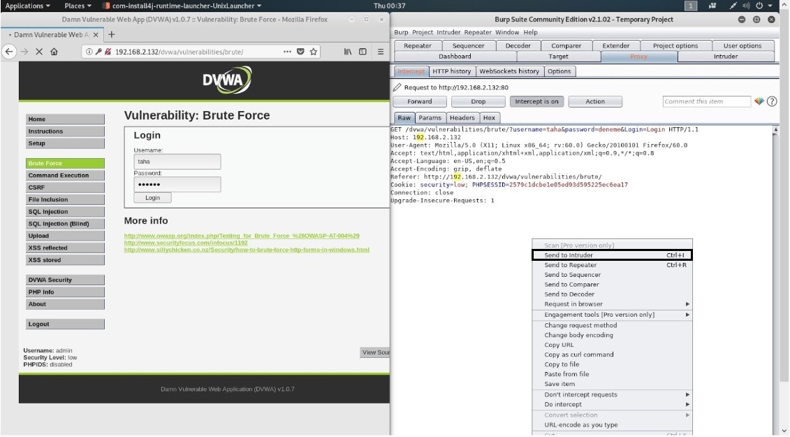 Sonra Burp Suite’i ve DWVA brute force sekmesini açıyoruz. Burp Suite’de Proxy -> Intercept sekmesine gelip intercept on durumuna getiriyoruz. Böylelikle ağda yaptığımız hareketi inceliyoruz. Sonra giriş panelimize rastgele bir kullanıcı adı ve şifre deniyoruz ve bu işlem intercept ekranımıza düşüyor.