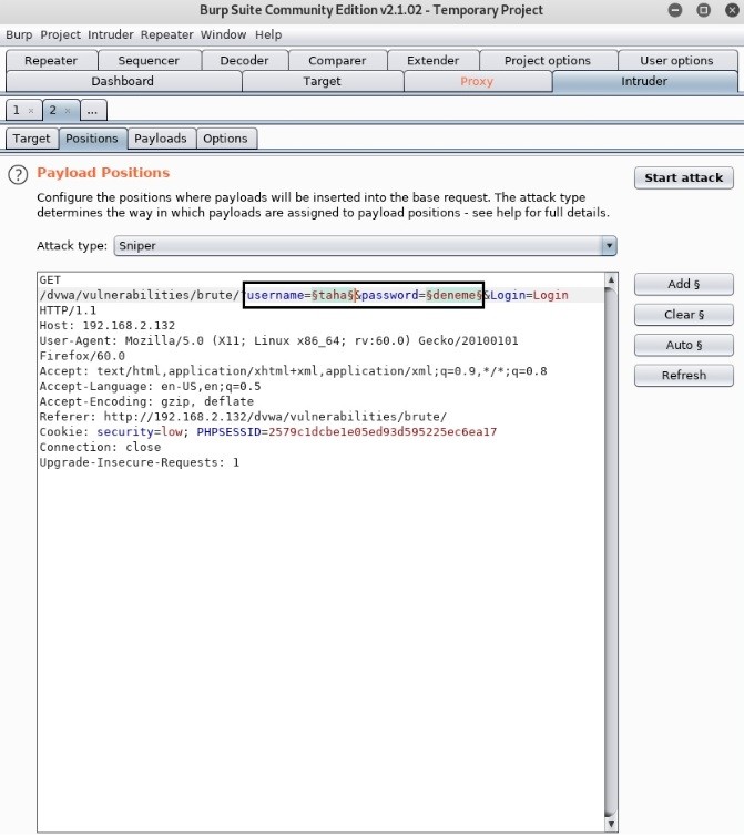 Sağ tık yapıp Send to Intruder diyoruz. Intruder ekranımıza geliyoruz. Positions sekmesinden parametrelimizi temizlemek için Clear’a basıyoruz ve denediğimiz isim ve şifreyi seçip Add’e basarak saldırı parametresi için ekliyoruz.