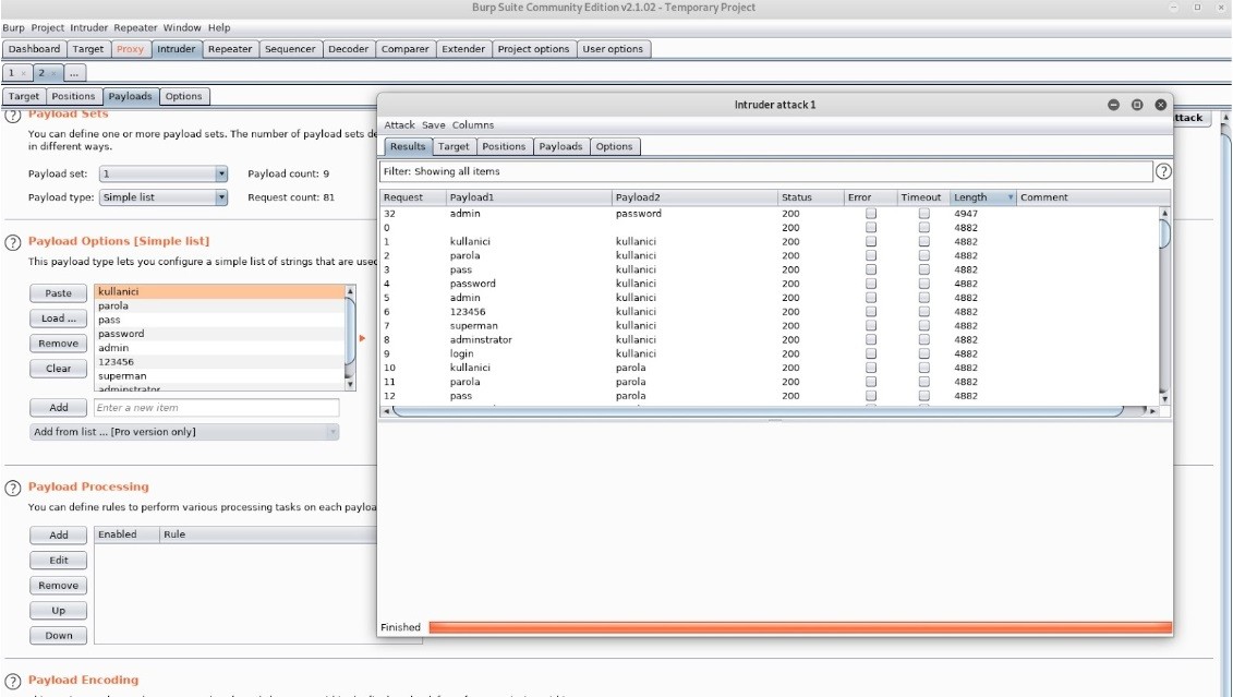 Sonra payloads ekranımıza geliyoruz ve masaüstüne leafpad’den bir wordlist oluşturuyoruz. Wordlist’e istediğimiz kulanıcı adını ve şifreyi girebiliriz ya da wordlist hazırlamak istemiyorsanız internetteki birçok wordlisti indirebilirsiniz. Payload Options’a gelip Load diyerek bu wordlistimizi Burp Suite’e ekliyoruz. Payload Set 2’ye gelip listemizi oraya da ekliyoruz. Sonra saldırıyı başlatıyoruz.
