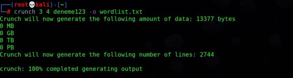 Resimde de gördüğünüz gibi oluşturacağımız kelime listesinde ki her bir kelimenin uzunluğunu minimum(3) ve maksimum(4) değerleri ile belirttik ve “deneme123” kelimeleri ile bizlere bir wordlist oluşturmasını istedik.