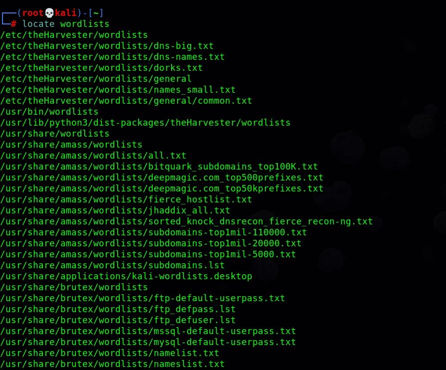 Terminal üzerinde “locate wordlists” komutu ile bir arama yaparsanız wordlistlerin lokasyonlarını görebilirsiniz.
