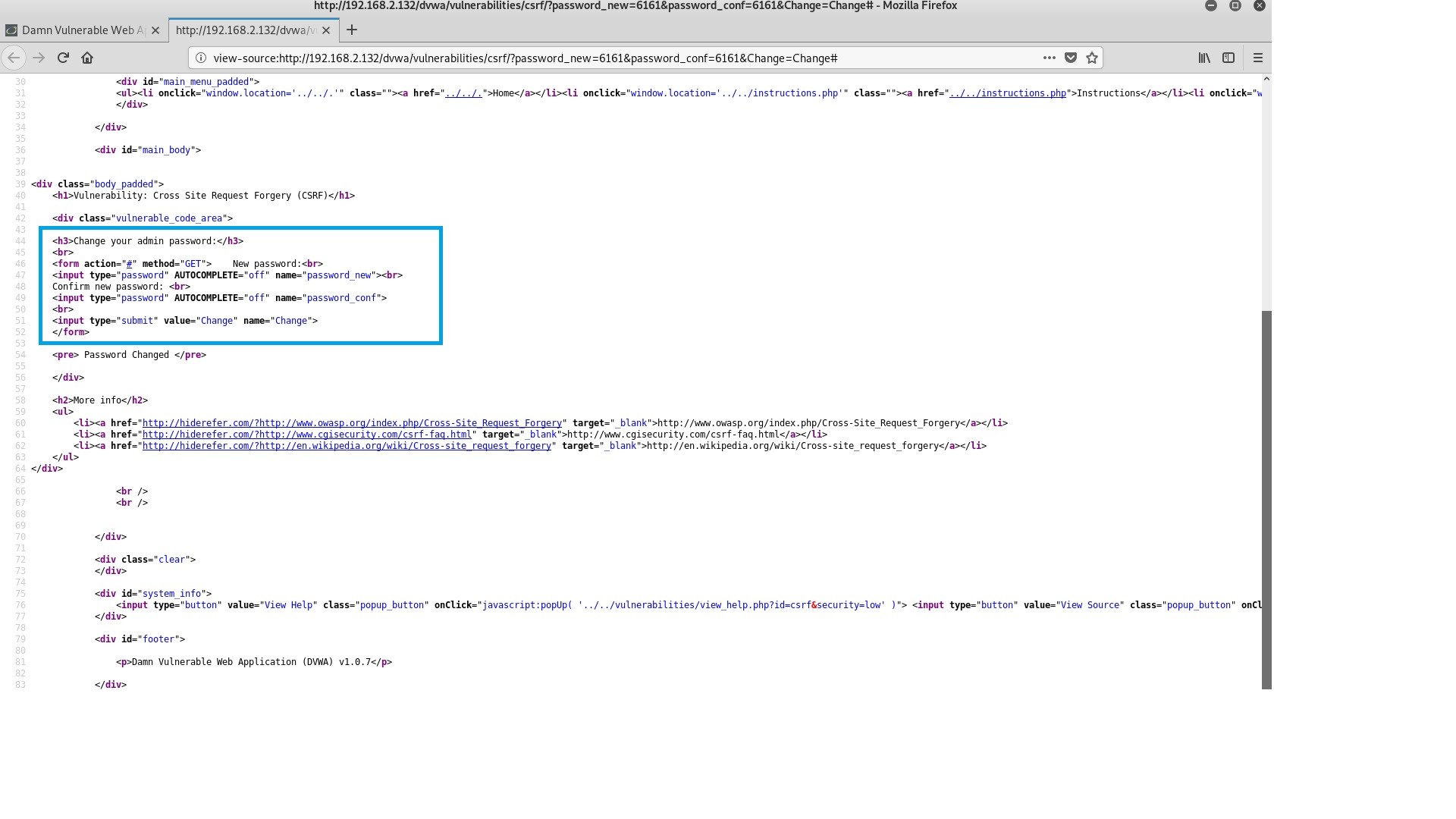 Şimdi şifre değiştirme yerine 6161 yazarak şifremi değiştiriyorum. Arama çubuğuna baktığım zaman password_new=6161&password_sonf=6161&Change gibi devam eden bir kısım görüyorum. Bu kısım bile açıkça CSRF olduğunun göstergesi. Devam edelim, şifrem başarıyla değiştikten sonra sayfa üzerinde sağ tık yapıp View Source diyerek diyerek sayfa kaynağına gidiyorum. İşlemin gerçekleştiği kod parçasını kopyalıyorum.