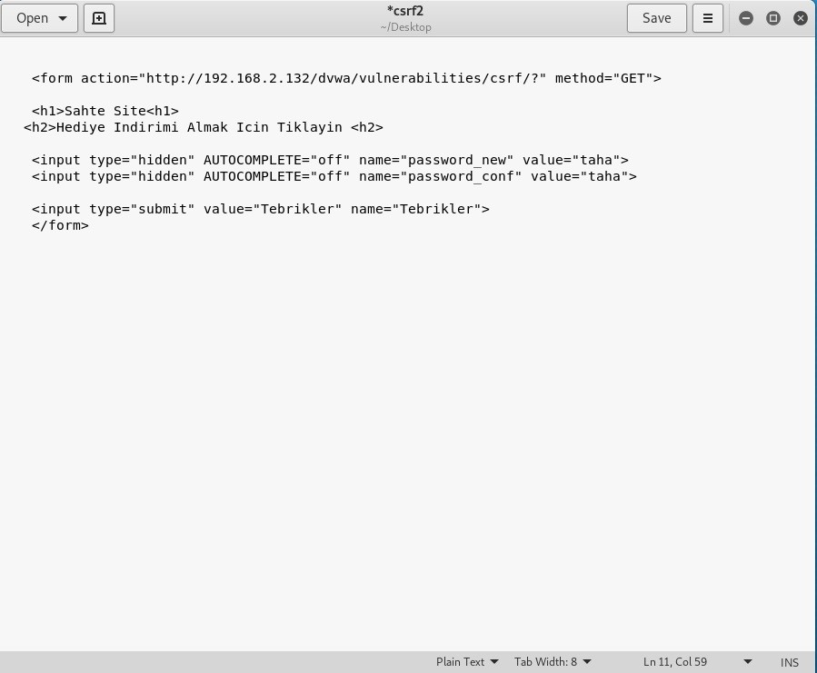 Şimdi bir saldırgan gibi düşünüp bu kod parçasını not defterinde saldırıya hazır hale gelecek şekilde düzenliyorum ve html olarak kaydediyorum. Saldırganın genelde bu aşamadan sonra saldırının hemen farkedilmemesi için yapması gereken css koduyla sayfayı süsleyip hedef bağlantıya kurbanın sosyal mühendislik yöntemleriyle tıklamasını sağlamak.