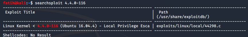 searchsploit ile 4.4.0-116 sürümünü aradık ve local privilege escalation (yerel yetki yükseltme?) zafiyeti için c ile yazılmış bir exploit bulduk.