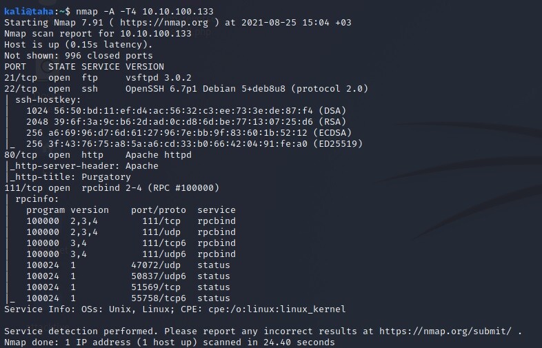 nmap -A -T4 10.10.100.133 ftp, ssh, http portunun açık olduğu görülüyor.