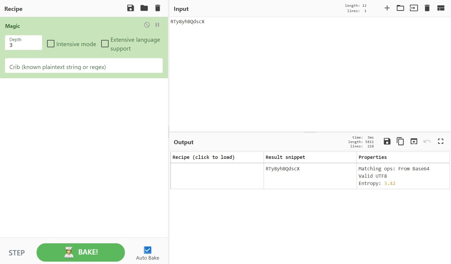 https://gchq.github.io/CyberChef/ sayfasına gidilip Magic modülü ile bu hash aratıldığında hash’in base64 olduğu görülüyor fakat base64 ile decode edilmek istendiğinde mantıklı bir string ifade bulunamıyor.