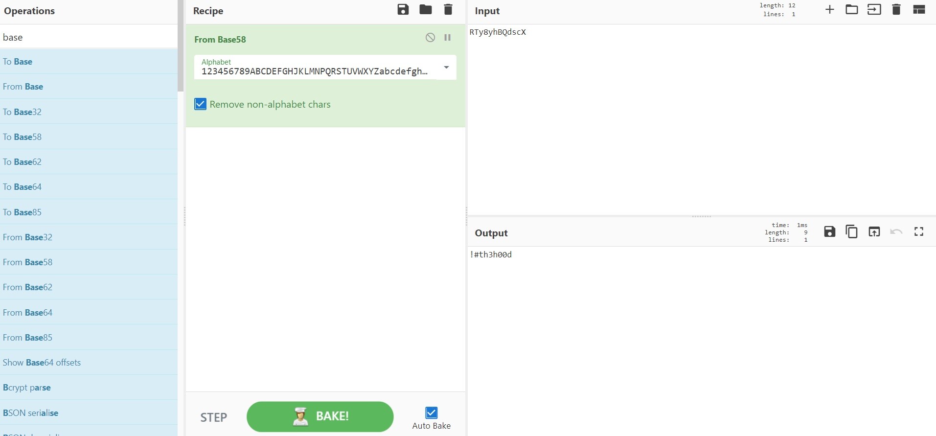 Sırasıyla base32, base58, base62 decode edilmek istendiğinde base58’de “!#th3h00d” ile doğru bir string ifade bulunuyor.