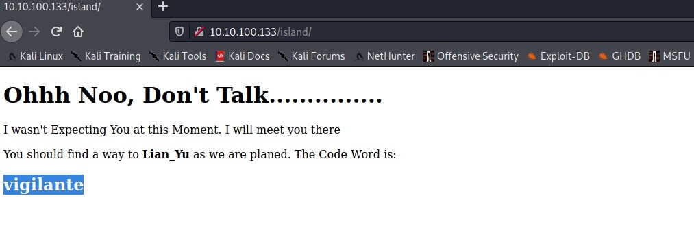 10.10.100.133/island sekmesine gidildiğinde imleç ile tıklandığında gözüken beyaz renk font ile yazılmış “vigilante” kelimesi ortaya çıkıyor. Bu kelime parola ya da kullanıcı adı olabilir.