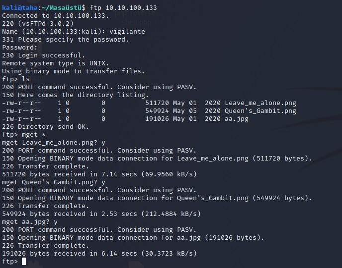 ftp 10.10.100.133 ile ftp bağlantısi sağlanmak istendiğinde kullanıcı adı olarak “vigilante” parola olarak da “!#th3h00d” kullanıldığında başarı ile bağlantı sağlanır.