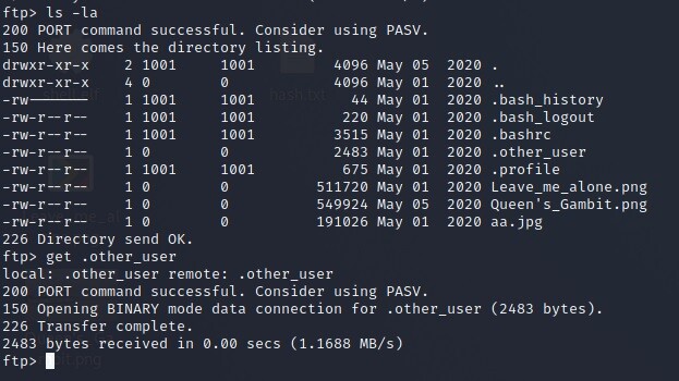 ls -la tüm dosyalar görüntülenip .other_user dosyası da yerel makineye aktarılır.
