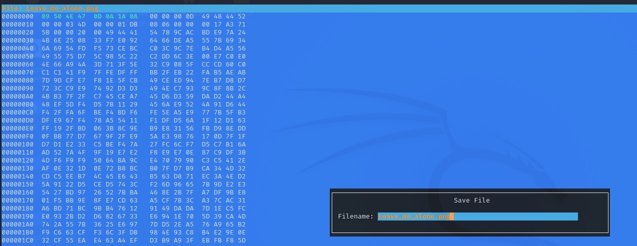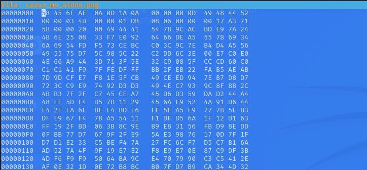 hexeditor Leave_me_alone.png ile görüntülendiğinde dosya imzasının hex’i 58 45 6F AE 0A 0D 1A 0A olduğu görülüyor.