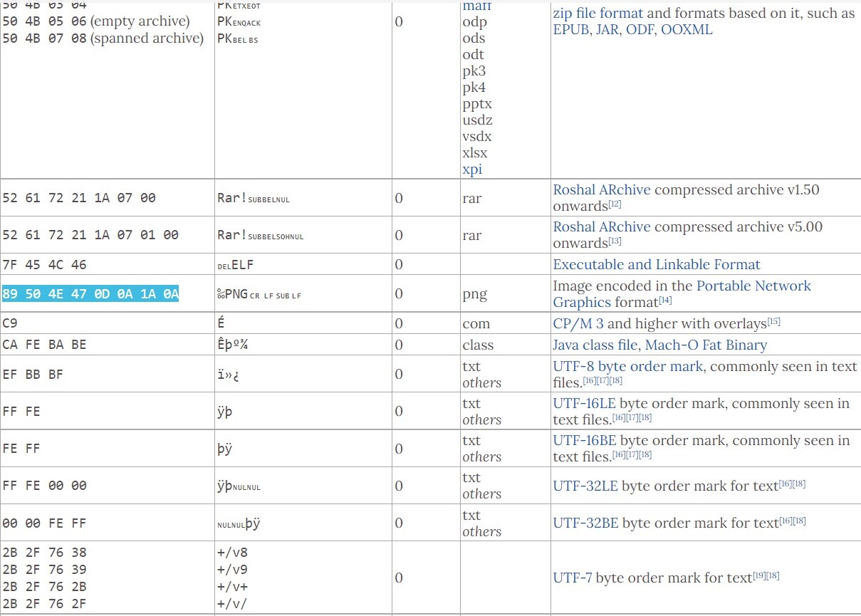 https://www.wikiwand.com/en/List_of_file_signatures dosya imza hex’lerine bakıldığında png hex’i 89 50 4E 47 0D 0A 1A 0A olduğu görülüyor.