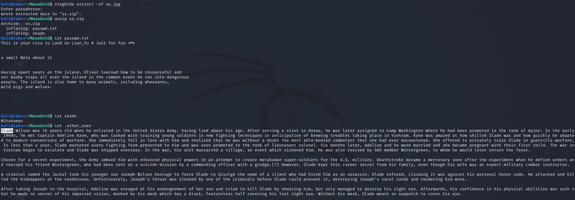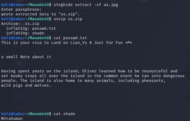 unzip ss.zip ile zip dosyası açıldığında shado ve passwd.txt dosyaları bulunuyor ve shado dosyasına bakıldığında “M3tahuman” parolası görüntülenir.