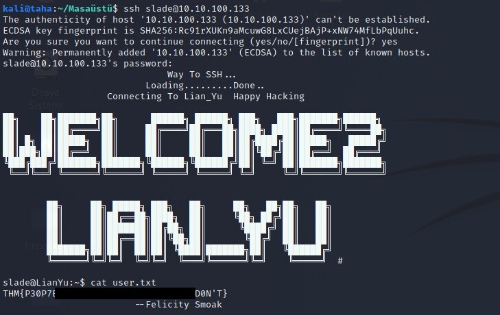 ssh slade@10.10.100.123 ile “M3tahuman” parolasıyla bağlanıldığında başarılı ssh bağlantısı kuruldu.