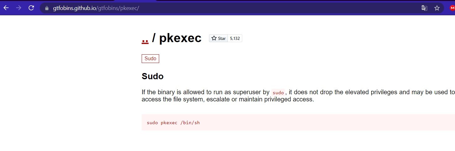 Gtfobins sitesinde pkexec aratıldığında sudo pkexec /bin/sh ile yetki yükseltilebildiği görülüyor.