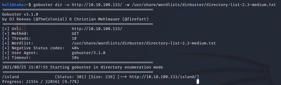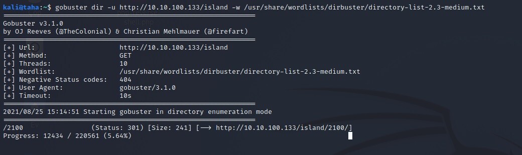 gobuster dir -u http://10.10.100.133/island -w /usr/share/wordlists/dirbuster/directory-list-2.3-medium.txt ile arama yapıldığında 10.10.100.133/island/2100 sayfası ile karşılaşılıyor.
