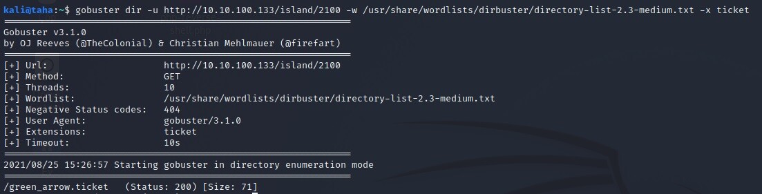gobuster dir -u http://10.10.100.133/island -w /usr/share/wordlists/dirbuster/directory-list-2.3-medium.txt -x ticket ile .ticket uzantılı sayfalar aratıldığında green_arrow.ticket sayfası bulunuyor.
