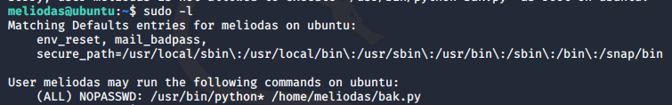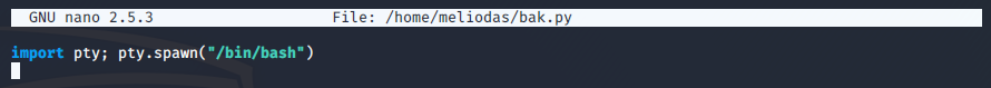 sudo komutuyla sadece “/home/meliodas/” dizinindeki “bak.py” python scriptini çalıştırabileceğimizi söyledi. Ama çalıştırınca da hiçbir etki etmediğini farkediyoruz.
