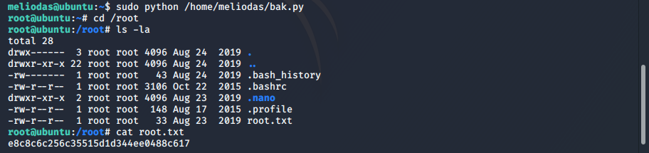 Bu scripti sudo ile çalıştırabildiğimiz için pty modülü ile etkileşimli kabuğa (interactive shell) çevirerek root erişimini sağlayabiliriz. nano ile değiştirmeye çalışınca yazmaya korumalı olduğu için başaramadık. Ancak silmeye korumalı olmadığı için dosyayı silip aynı dizine yeni bir “bak.py” dosyası oluşturuyoruz ve kodu ekliyoruz. Kodun kaynağı için tıklayınız.