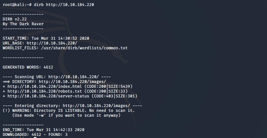 Burada birkaç kullanıcı adı dışında bir şey bulamadık. DIRB aracıyla dosya/dizin taraması gerçekleştiriyoruz.