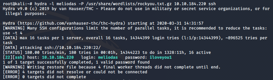 Bize “rockyou” adlı bir ipucu verdi. “rockyou.txt” sık kullanılan parolaların toplandığı bir wordlisttir. Blogda “meliodas” adlı bir kullanıcı adı farketmiştik. Bu kullanıcı adını ve rockyou.txt’yi kullanarak sunucuya ssh ile bağlanmayı deneyeceğiz. Bu aşamada Hydra aracını kullanacağız.