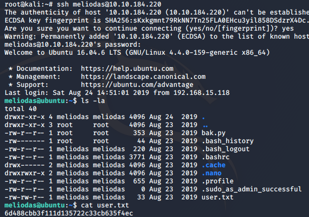 Parolayı “iloveyou1” olarak bulduk ve ssh ile bağlanıyoruz. -ls -la ile gizli dosyaları sıralı listeliyoruz ve cat ile “user.txt”yi okutup ilk bayrağımıza ulaşıyoruz.