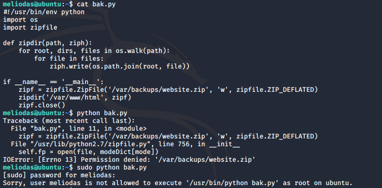 “Bak.py” adındaki python scriptini incelediğimizde işe yarar bir şey çıkmadı. Çalıştırmayı deneyince “permission denied” hatası alıyoruz. Son olarak sudo ile çalıştırmayı deniyoruz, bu sefer de meliodas kullanıcısının buna izni olmadığını söylüyor.