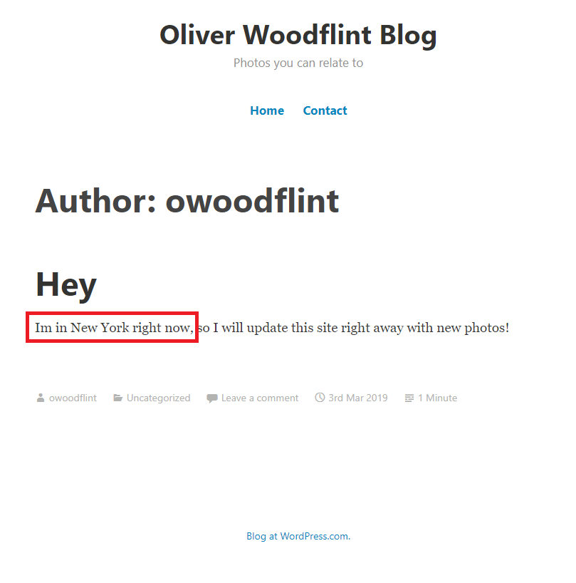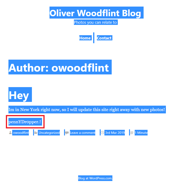 Karşımıza direkt şu anda New York‘ta olduğunu söyleyen bir post çıkıyor. Sayfa sıradan bir blog sitesi olarak gözükmekte ve kaynak koduna baktığımızda da dikkat çeken bir şeyle karşılaşmadık. Ancak kelimeleri vurguladığımızda son olarak bizden istenen parolayı da pennYDr0pper.! olarak bulduk.