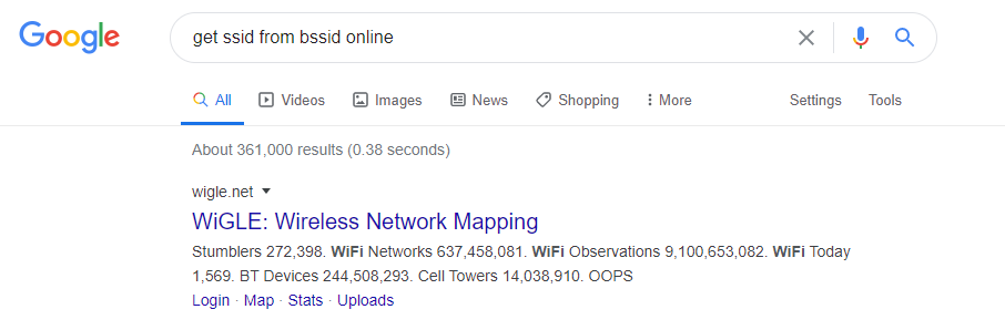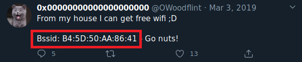 Buradan da profil fotoğrafını kedi olarak bulduk. Attığı ilk tweet’e bakınca bir BSSID paylaştığını görüyoruz. BSSID’nin (basic service set identifier) benzeri bulunmayan bir adres olduğunu öğreniyoruz. Bize sorulan SSID’nin buradan bulacağını tahmin ederek Google’da şöyle bir arama yaptım: