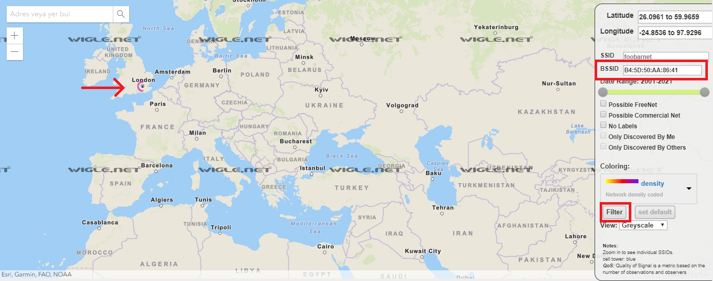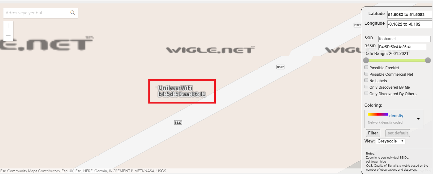 BSSID kısmına Twittar’dan bulduğumuz adresi kopyalayıp filtrele tuşuna bastıktan sonra Londra’da olduğunu tespit ettik ve yakınlaştırınca SSID’sini de UnileverWiFi olarak bulduk.