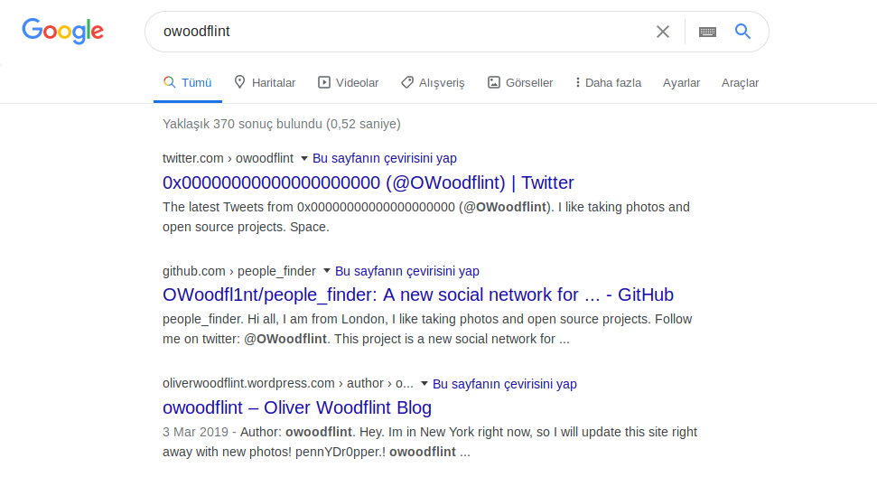 Arama sonucunda bu isimle ilişkini bir Wwitter profili, bir Github reposu ve bir de WordPress kullanarak oluşturulmuş blog sitesiyle karşılaştık. Sırası önemsiz olduğu için önce Github reposunu açıyoruz.
