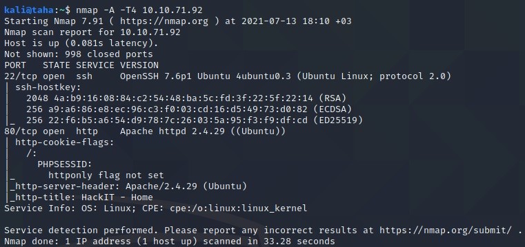 nmap -A -T4 10.10.71.92 ile nmap taraması yapıldığında 22 ve 80 portunun açık olduğu görülüyor. Apache http sunucu versiyonu 2.4.29 olduğu görülüyor.